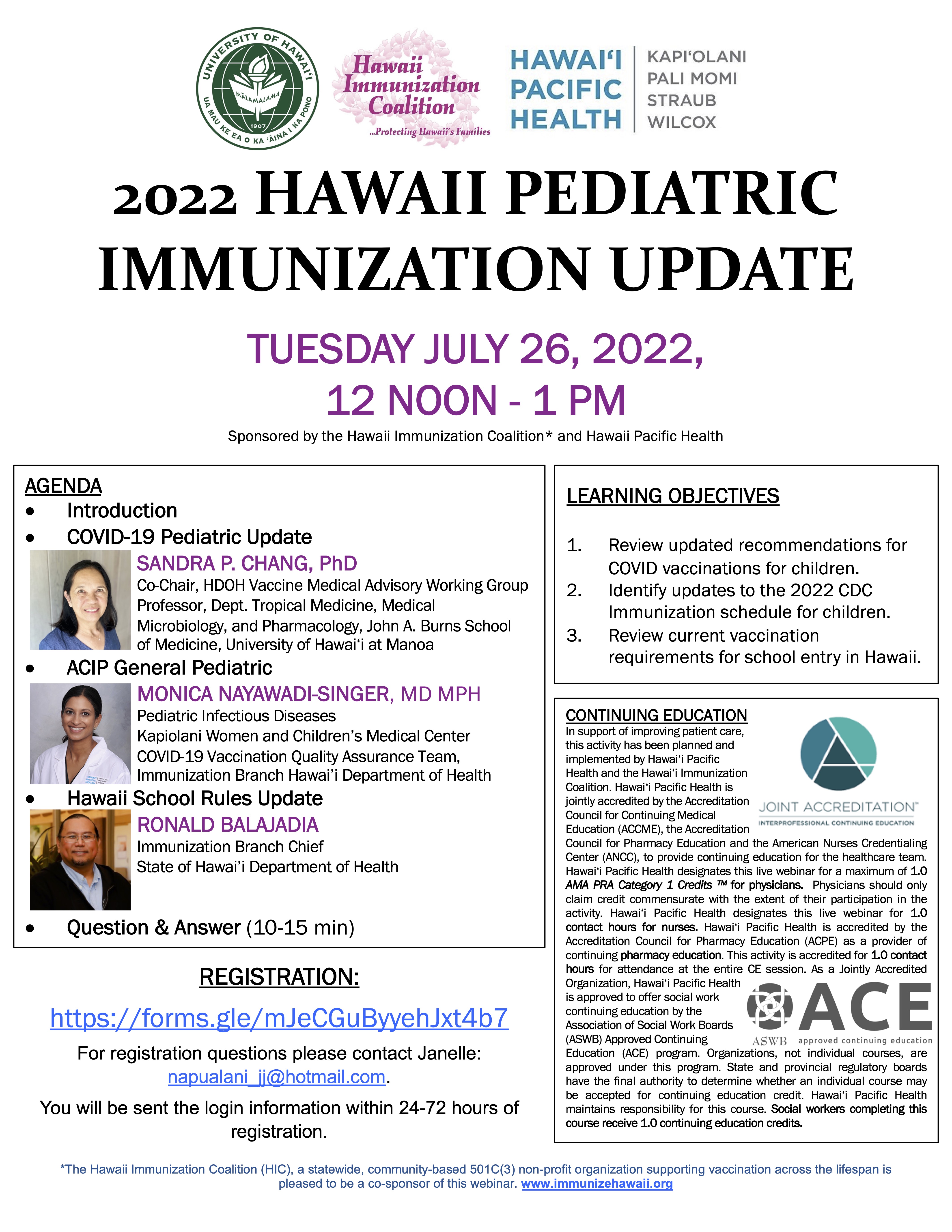 Flyer for July 26, 2022 2022 Hawaii Pediatric Immunization Update